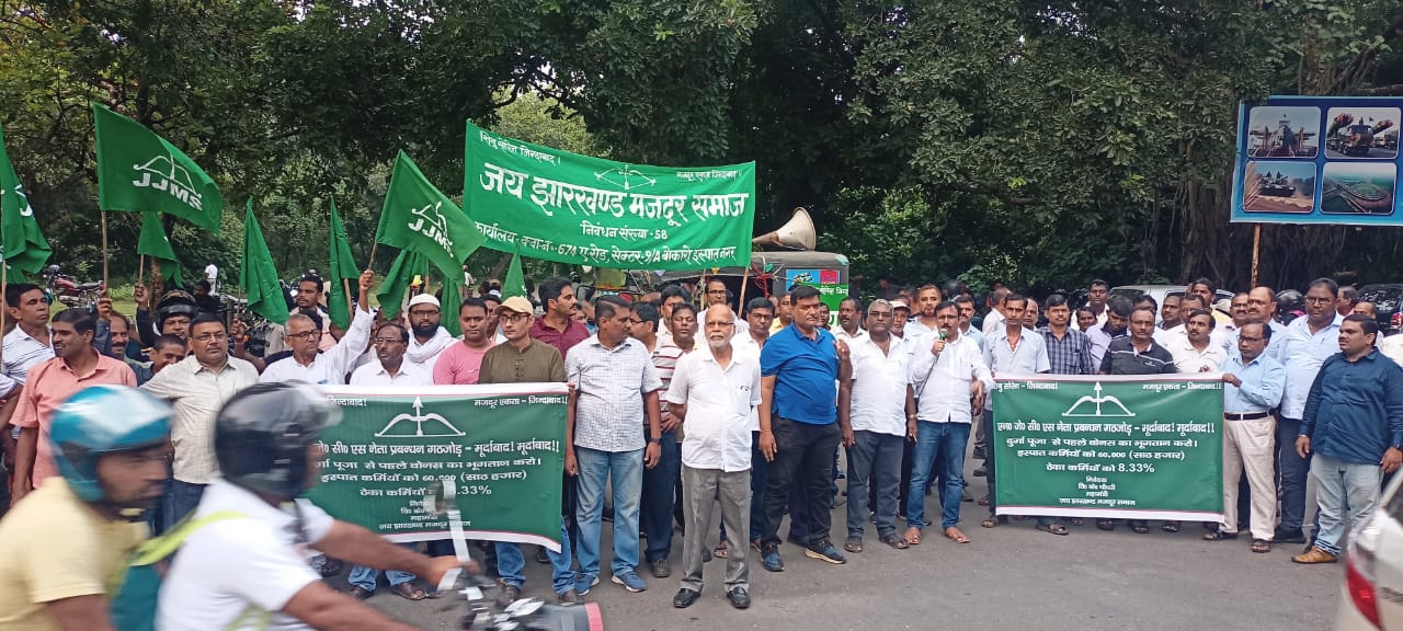 दशहरा से पहले मजदूरों को बोनस नहीं मिलने, मजदूर विरोधी हस्ताक्षर करने वाले एनजेसीएस के नेताओं के खिलाफ सोमवार को बीएसएल गेट पास सेक्सन के समीप जय झारखंड मजदूर समाज ने जोरदार प्रदर्शन किया। जिसका नेतृत्व महामंत्री बीके चौधरी किया। प्रदर्शन के दौरान लोगों ने इस्पात प्रबंधन और एनजेसीएस के खिलाफ जमकर नारेबाजी की। महामंत्री ने प्रबंधन को चेतावनी देते हुए कहा कि सेल के इतिहास में पहली बार ऐसा होने जा रहा है कि दशहरा के पहले बोनस भुगतान नहीं होने जा रहा है। कहा कि एनजेसीएस के नेताओं और सेल प्रबंधन के बीच अभी भी नूरा कुश्ती कर मजदूरों को ठगने और गुमराह करने का काम किया जा रहा है। एनजेसीएस के नेताओं में अगर मजदूरों के प्रति संवेदनशीलता रहती तो 40000/ की जगह 69750/ की मांग प्रेषित करता। चौधरी ने कहा कि राशि को लेकर यूनियन के साथ गुप्त समझौता हो चुका है उसे एडहाक के रूप में पूजा पूर्व भुगतान किया जाए। बाद के 10 अक्तूबर को प्रस्तावित एनजेसीएस की बैठक में अगर प्रबंधन मांगों के अनुसार बाकी भुगतान नहीं करता है तो इन नेताओं को हड़ताल की नोटिस देनी चाहिए, जिसका समर्थन जय झारखंड मजदूर समाज करेगा।