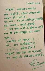 Bokaro: 12 मार्च अपने जन्मदिन के अवसर पर उपायुक्त अजय नाथ झा ने सोशल मीडिया मंच फेसबुक पर एक अत्यंत भावनात्मक कविता साझा की। इस कविता के माध्यम से उन्होंने अपने बाबूजी की स्मृतियों को याद करते हुए मन की गहरी संवेदनाओं को शब्दों में व्यक्त किया है। कविता में उन्होंने लिखा है कि लोग कहते हैं कि जीवन कभी रुकता नहीं और हर परिस्थिति में जीना ही पड़ता है, लेकिन कभी-कभी मन किसी स्मृति में ठहर जाता है। बहते समय और भागती दुनिया के बीच मन एक ऐसे द्वीप की तरह हो जाता है जो स्थिर और जड़ प्रतीत होता है, जिसे केवल मन ही महसूस कर सकता है। अपने जन्मदिन के दिन साझा की गई इस कविता में उन्होंने यह भी व्यक्त किया कि शुभकामनाओं के बीच भी मन निर्विकार और उमंगहीन हो सकता है, जब स्मृतियां गहराई से मन को छूती हैं। उल्लेखनीय है कि उपायुक्त की इस भावनात्मक पोस्ट को सोशल मीडिया पर लोगों द्वारा काफी सराहा जा रहा है। कई लोगों ने इसे संवेदनशील, हृदयस्पर्शी और जीवन के गहरे भावों को व्यक्त करने वाली रचना बताया है।